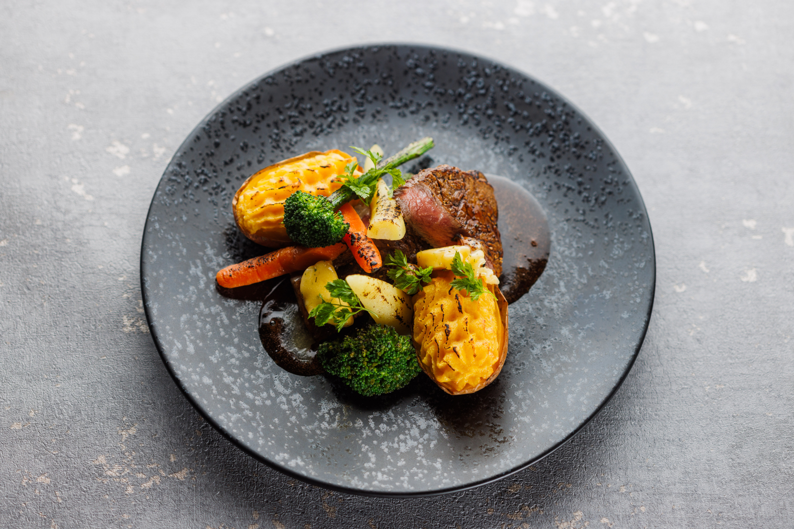 Main course: beef petite tender and winter vegetables (organic grass-fed beef petite tender, sweet potato brûlée, pumpkin cream, caper broccolini, and rosemary sauce)