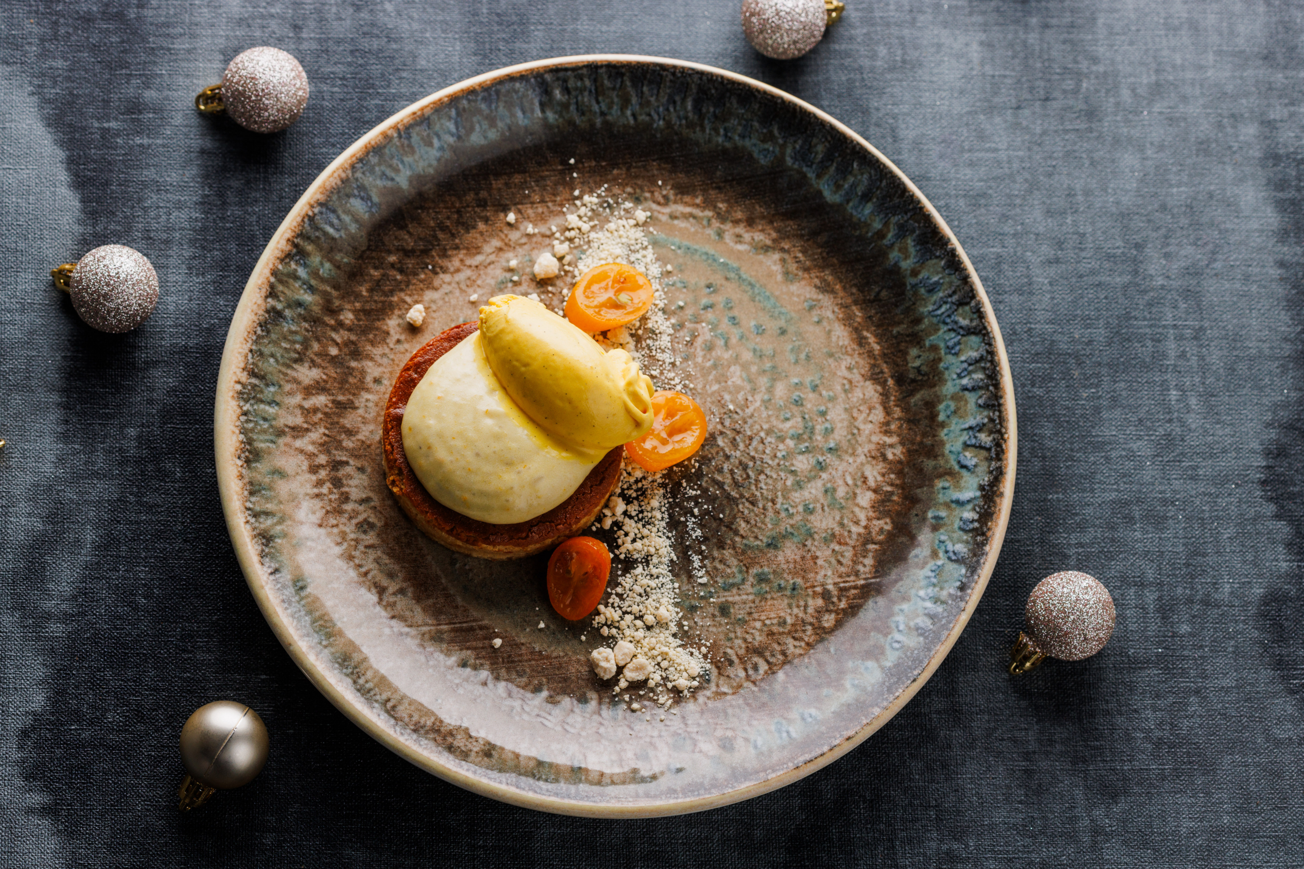 Dessert: almond and kumquat (almond cake, kumquat mousse, pumpkin and vanilla gelato)